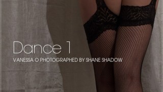 Description: Becky Berry poses in leather bra and panty and matching stilettos before pleasing herself with a black vibrator